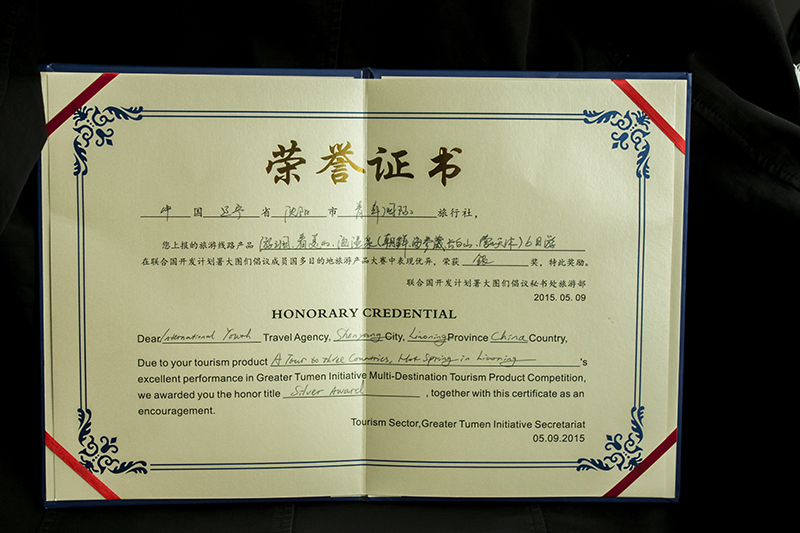 2015年5月9日 我社的旅游產(chǎn)品:游三國(guó)、看美山、泡溫泉、(朝鮮、海參崴、長(zhǎng)白山、營(yíng)口天沐)6日游 ,在聯(lián)合國(guó)開發(fā)計(jì)劃署大圖們倡議成員國(guó)多目的地旅游產(chǎn)品大賽中表現(xiàn)優(yōu)異,榮獲銀獎(jiǎng)!
