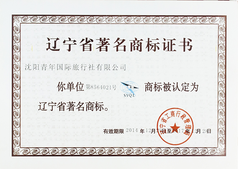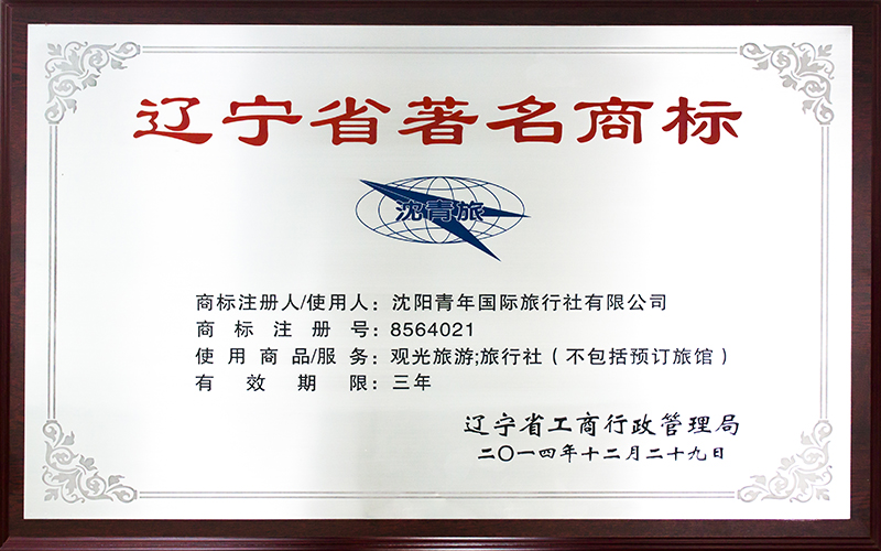 近日,我社成功獲得《遼寧省著名商標(biāo)證書》,沈陽青年國際旅行社有限公司商標(biāo)被認(rèn)定為遼寧省著名商標(biāo)。