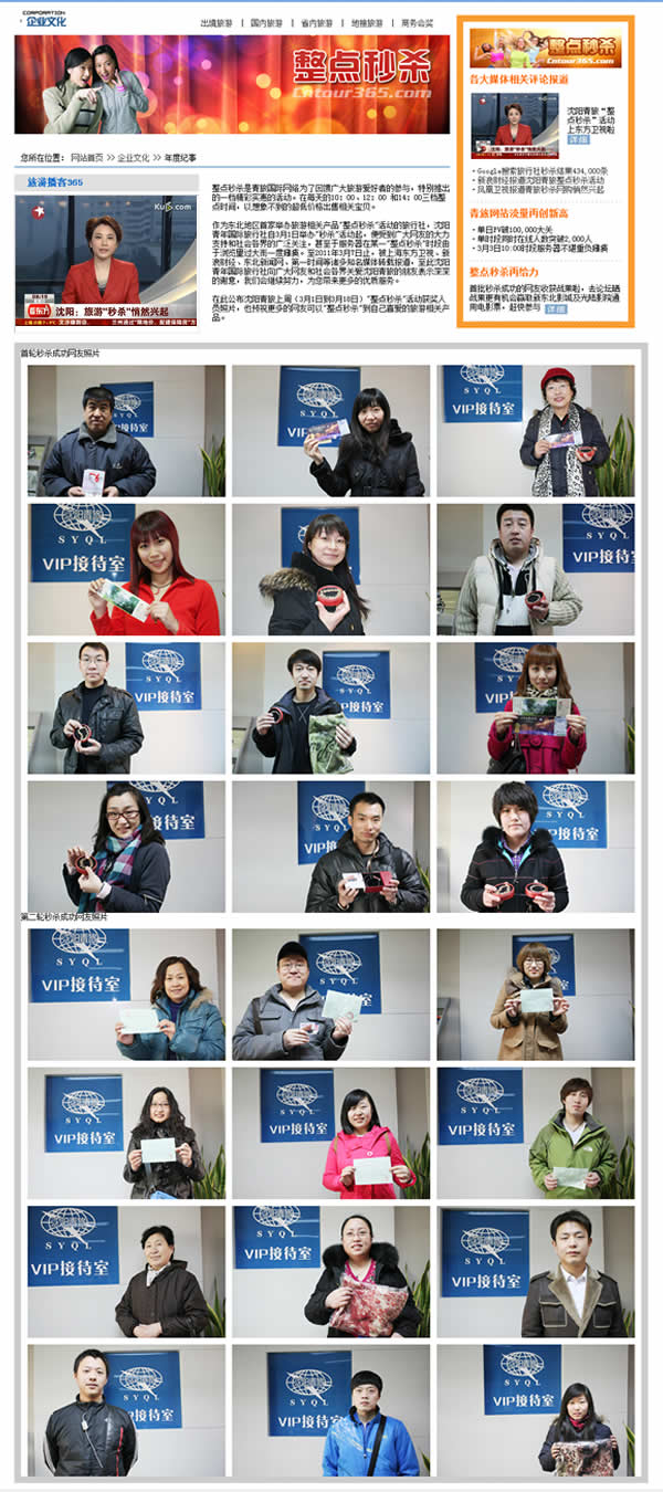 作為東北地區(qū)首家舉辦旅游相關(guān)產(chǎn)品“整點(diǎn)秒殺”活動(dòng)的旅行社,沈陽(yáng)青年國(guó)際旅行社自3月1日舉辦“秒殺”活動(dòng)起,便受到廣大網(wǎng)友的大力支持和社會(huì)各界的廣泛關(guān)注,甚至于服務(wù)器在某一'整點(diǎn)秒殺'時(shí)段由于瀏覽量過(guò)大而一度癱瘓。至2011年3月7日止,被上海東方衛(wèi)視、新浪財(cái)經(jīng)、東北新聞網(wǎng)、第一時(shí)間等諸多知名媒體轉(zhuǎn)載報(bào)道,至此沈陽(yáng)青年國(guó)際旅行社向廣大網(wǎng)友和社會(huì)各界關(guān)愛(ài)沈陽(yáng)青旅的朋友表示深深的謝意,我們會(huì)繼續(xù)努力,為您帶來(lái)更多的優(yōu)質(zhì)服務(wù)。