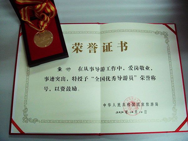 沈陽(yáng)青旅員工童帥,在從事導(dǎo)游工作中,愛(ài)崗敬業(yè),實(shí)績(jī)突出,被中華人民共和國(guó)國(guó)家旅游局授予“全國(guó)優(yōu)秀導(dǎo)游員”榮譽(yù)稱號(hào)。