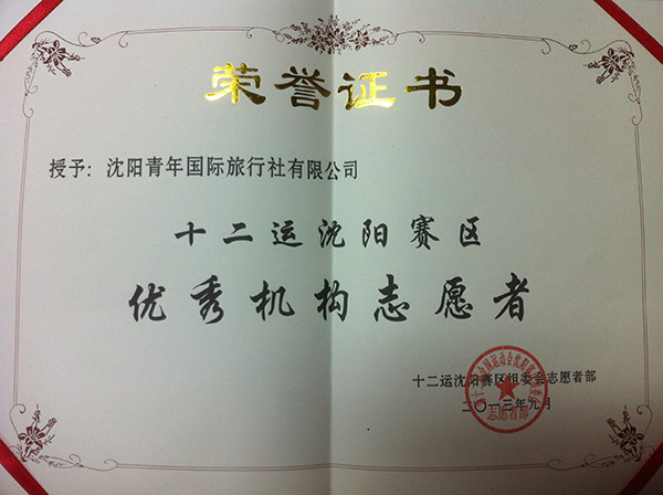 熱烈慶祝沈陽(yáng)青年國(guó)際旅行社榮獲“第十二屆全運(yùn)會(huì)沈陽(yáng)賽區(qū)優(yōu)秀機(jī)構(gòu)志愿者”稱號(hào)