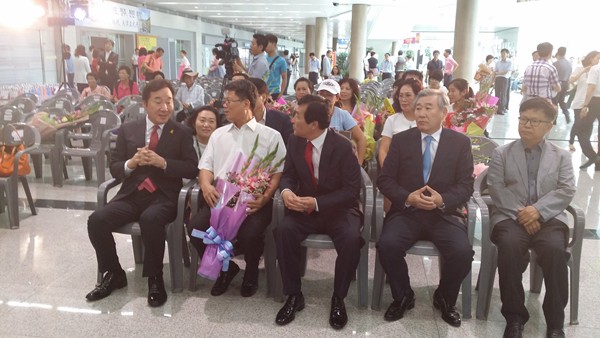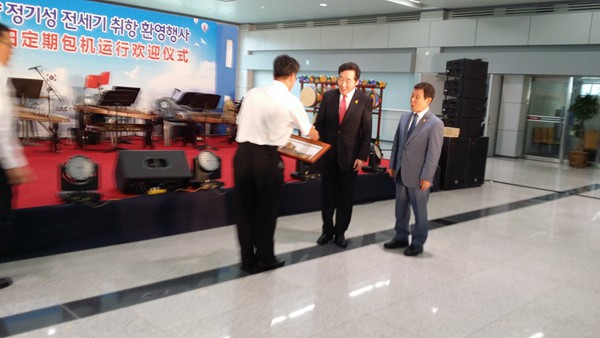 2014年7月16日,沈陽(yáng)青年國(guó)際旅行社韓國(guó)包機(jī)首發(fā)團(tuán)在董事長(zhǎng)倪琛善的帶領(lǐng)下落地韓國(guó)務(wù)安機(jī)場(chǎng),韓方舉辦了盛大而熱烈的啟航歡迎儀式。韓國(guó)光州廣域市市長(zhǎng)尹荘鉉、中國(guó)駐光州總領(lǐng)事王憲民、全羅南道知事李洛淵、全羅南道觀光協(xié)會(huì)會(huì)長(zhǎng)李江宇、務(wù)安郡郡守金澤州等領(lǐng)導(dǎo)對(duì)倪琛善董事長(zhǎng)及包機(jī)首發(fā)團(tuán)游客進(jìn)行親切友好的接待。雙方互贈(zèng)禮物,共同參加了韓方準(zhǔn)備的歡迎洽談宴會(huì)。